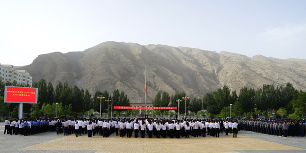 为庆祝中国共产党成立97周年,7月1日上午,阿合奇县、乡、村三级共4000余名党员干部群众,统一时间、内容及程序同步举行建党97周年暨“七一”升国旗重温入党誓活动。