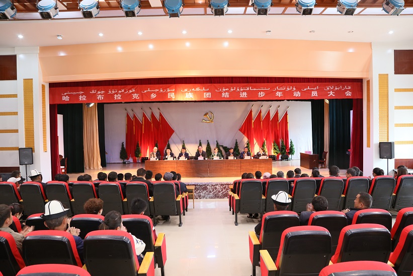 为切实学习好、宣传好、贯彻好、落实好自治区“民族团结进步年”活动总体要求和自治州、县委关于开展“民族团结进步年”活动的具体部署,5月24日,哈拉布拉克乡召开“民族团结进步年”动员大会。参加会议的有乡党政领导班子成员、村两委班子成员、乡机关党员干部、部分“两代表一委员”、自治区机关事务管理局“访惠聚” 住村工作组、学校教师和卫生院医护人员代表等150余人。